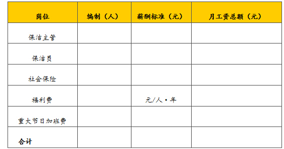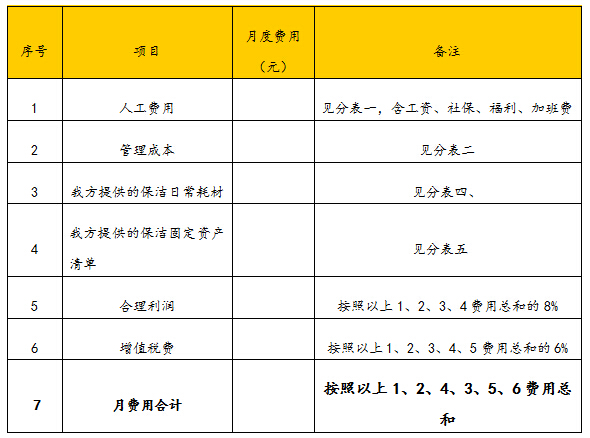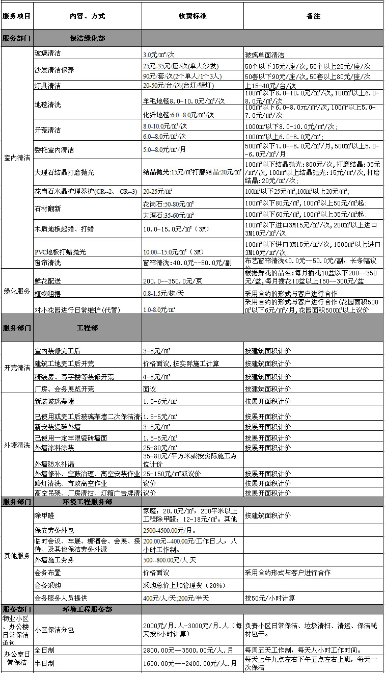 备注:1、大理石地面结晶养护根据甲方需求提供,按实际施工面积计算另计。2、外墙清洗:另计。3、其他有偿清洁服务按市价优惠计价。